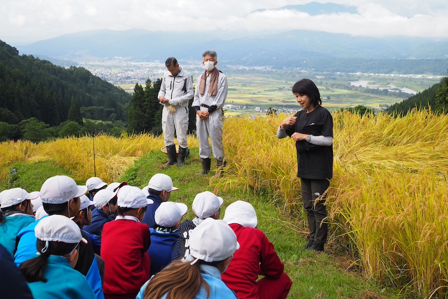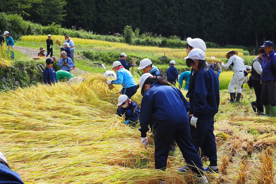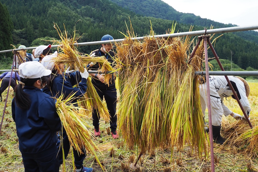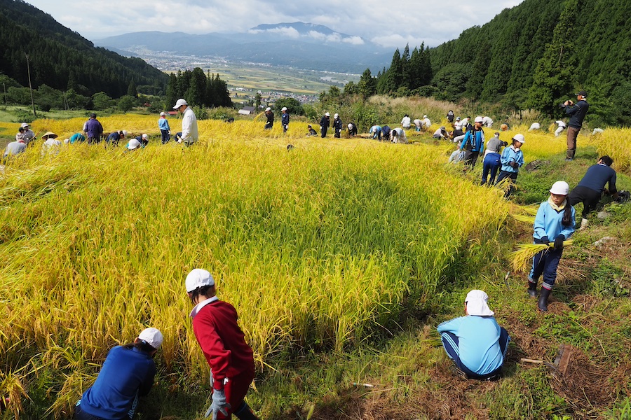 5月の田植えから4か月が経ち、黄金色の稲穂が揺れる福島棚田。4月に新設された飯山市立城北小学校の5年生41名が米づくり体験授業に訪れ、稲刈りとはぜ掛けの作業を行いました。