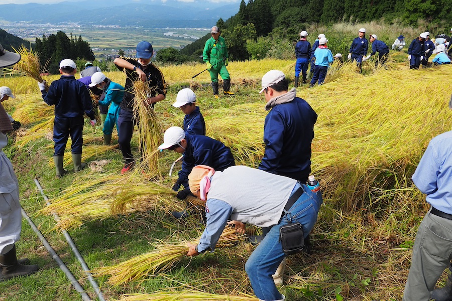 飯山市瑞穂地区の福島棚田では、26年前から誰でも参加できる田植え・稲刈り体験会を開催しています。今回は、飯山市公民館が主催する「飯山雪国大学地域学講座・飯山のお米学」で福島棚田を知った市民も数名参加しました。